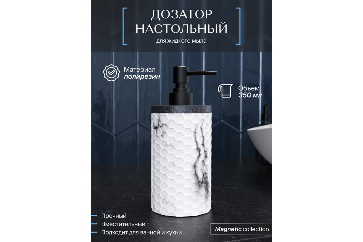 Объем: 0.35 л Материал корпуса: полирезин Поверхность: матовая Цвет корпуса: белый Стильный дозатор из полирезина 350 мл, прочный, влагостойкий, легко наполняется и отлично подходит для ванной или кухни.