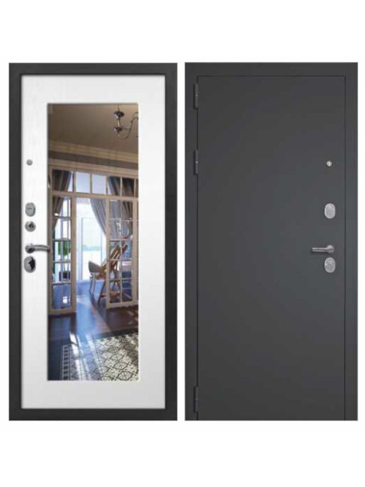 Стильная металлическая дверь идеально подходит для установки в квартиры и частные дома, обеспечивая надежную защиту и современный внешний вид. Зеркальная вставка расширяет пространство прихожей, а уникальное сочетание оттенков — "Черный муар" с блестками и "Ясень белый" — подчеркивает актуальность дизайна.