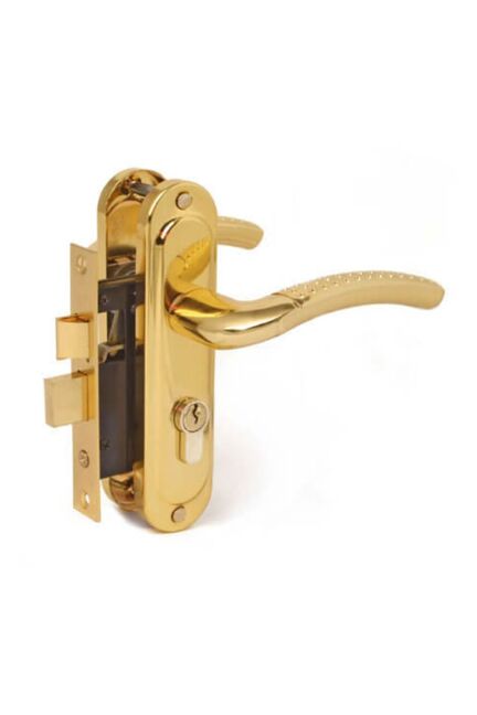 Врезной замок с золотым покрытием, межосевое расстояние 60 мм, подходит для любого типа дверей, надёжный корпус, простой монтаж.