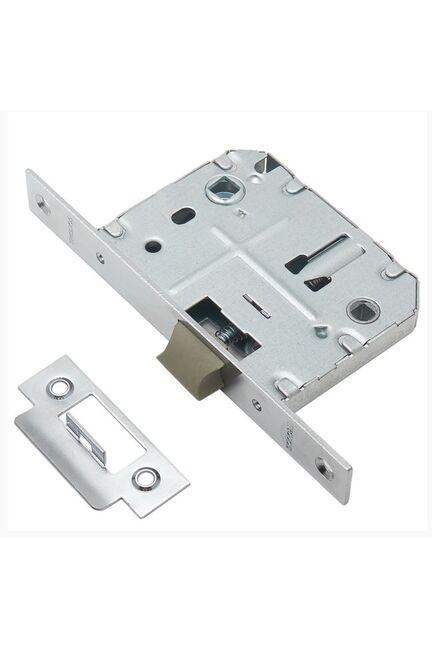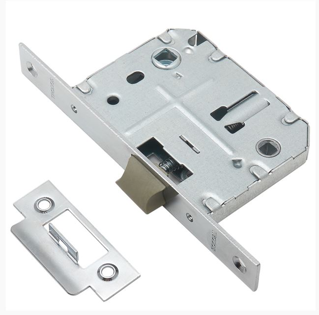 Врезная защелка с фиксацией, пластиковый корпус, хром, легкая установка, подходит для санузлов и межкомнатных дверей, надежна и долговечна.