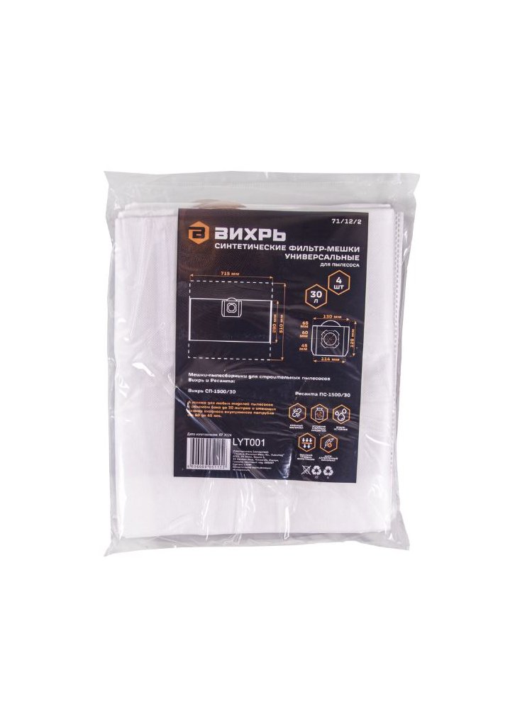 Мешки для строительного пылесоса ВИХРЬ синтетические 30л, 4шт