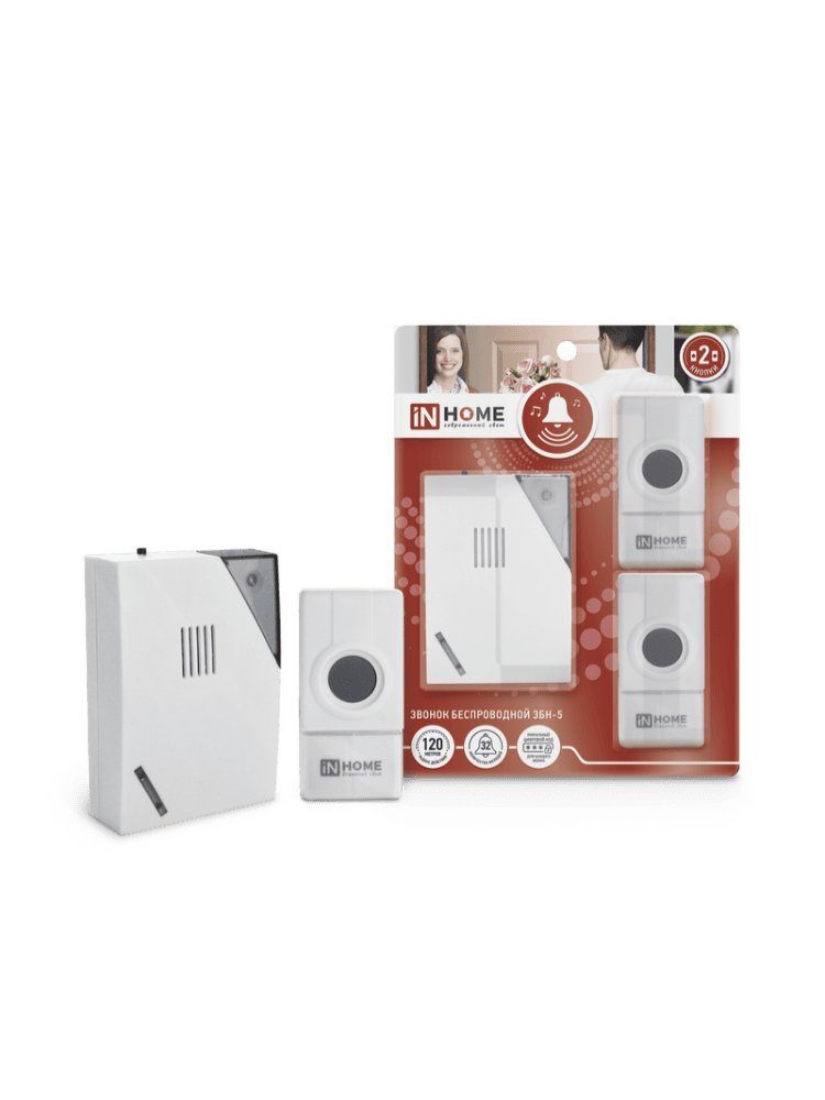 Звонок беспроводной ЗБН-5 32 мелодии 120м с цифр. кодир.с двумя кнопками IP44 БЕЛО-СЕРЫЙ IN HOME