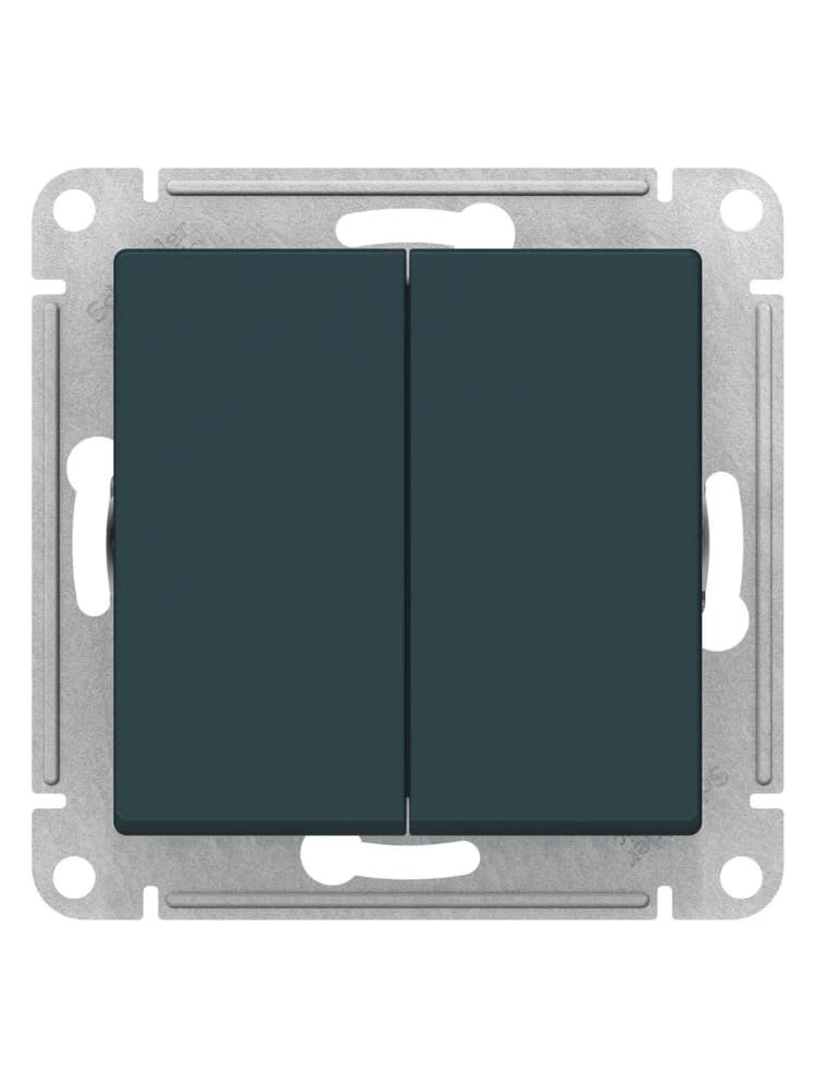 Элегантный двухклавишный моноблочный выключатель изумрудного цвета — стильное решение для создания комфортного управления освещением в доме, офисе или коммерческих помещениях. Подходит для скрытого монтажа в стандартные монтажные коробки.