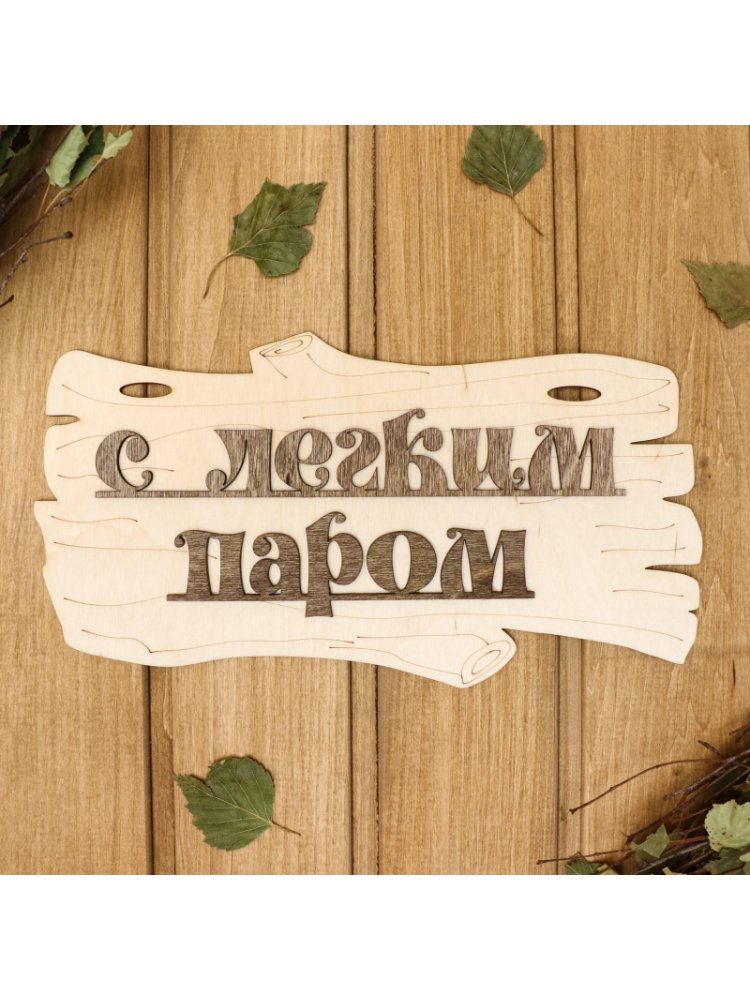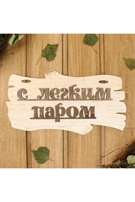 Табличка для бани в виде веника 30х17 см с надписью 'С лёгким паром!'. Устойчива к влаге и температурам, легко крепится, идеальна для декора бани.