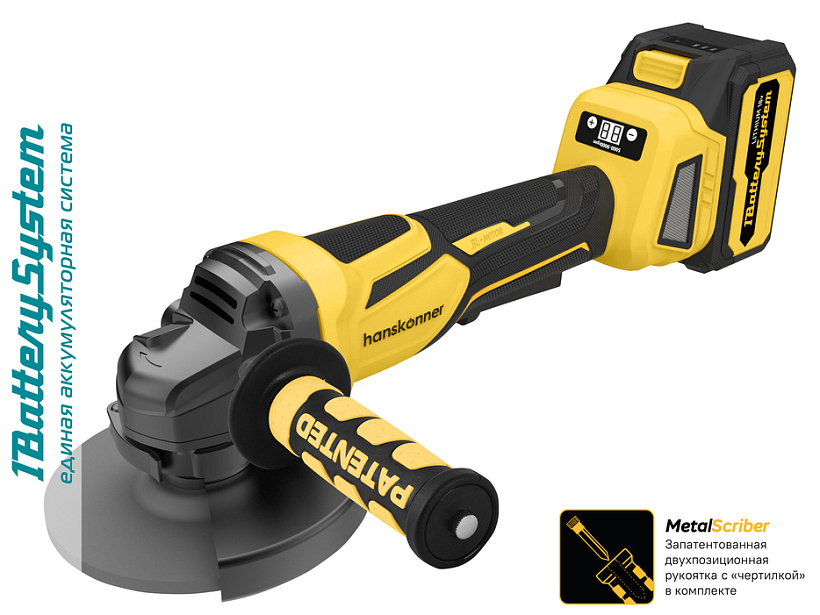 Hanskonner HAG1812E – маневренная 18 В аккумуляторная болгарка (УШМ) под рабочий диаметр диска 125 мм – является частью системы 1BatterySystem и совместима со всей линейкой инструмента данной системы. Обладает оптимальными массогабаритными показателями и выверенными пропорциями: малый диаметр корпуса гарантирует максимальное удобство хвата, нейтральный центр тяжести позволяет уверенно контролировать инструмент в процессе работы даже одной рукой, клиновидная форма корпуса редуктора облегчает работу в местах с трудным доступом. Инструмент оснащен бесщеточным электромотором Brushless Motor, характеризующимся на 30% большей производительностью в сравнении с обычными коллекторными моторами и лучшей долговечностью – отлично противостоит кратковременным перегрузкам, и не склонен к перегреву. Также, высокую надежность модели обеспечивают высококачественные фирменные подшипники С&U и система усовершенствованной пылезащиты «StoneCut», снижающая попадание пыли и абразивных частиц внутрь инструме