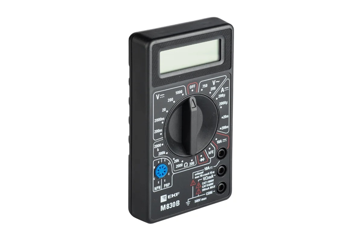 Цифровой мультиметр M830В EKF серии Master - это компактный прибор со следующим набором функций: - измерение постоянного напряжения (DCV) - измерение переменного напряжения (ACV) - измерение постоянного тока (DCA) - измерение электрического сопротивления - проверка диодов - проверка транзисторов Цифровой мультиметр: измеряет напряжение до 600 В, ток до 10 А, сопротивление до 2 МОм, есть прозвонка и тест диодов, легкий и точный инструмент.
