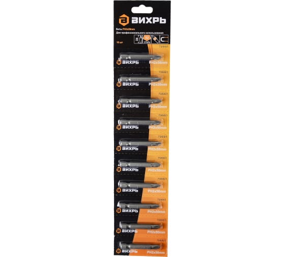 Бита Вихрь - предназначена для использования в качестве насадок в шуруповёртах, аккумуляторных отвёртках, ручных и реверсивных отвёртках со сменными насадками. Изготовлены биты из высококачественной инструментальной стали марки S2. Наконечник типа PН2 (Phillips) - крестообразный наконечник. Длина бит 50 мм. Твердость биты составляет 59-62 HRС. Основу биты составляет шестигранный хвостовик размером 6,35 мм (1/4 дюйма).