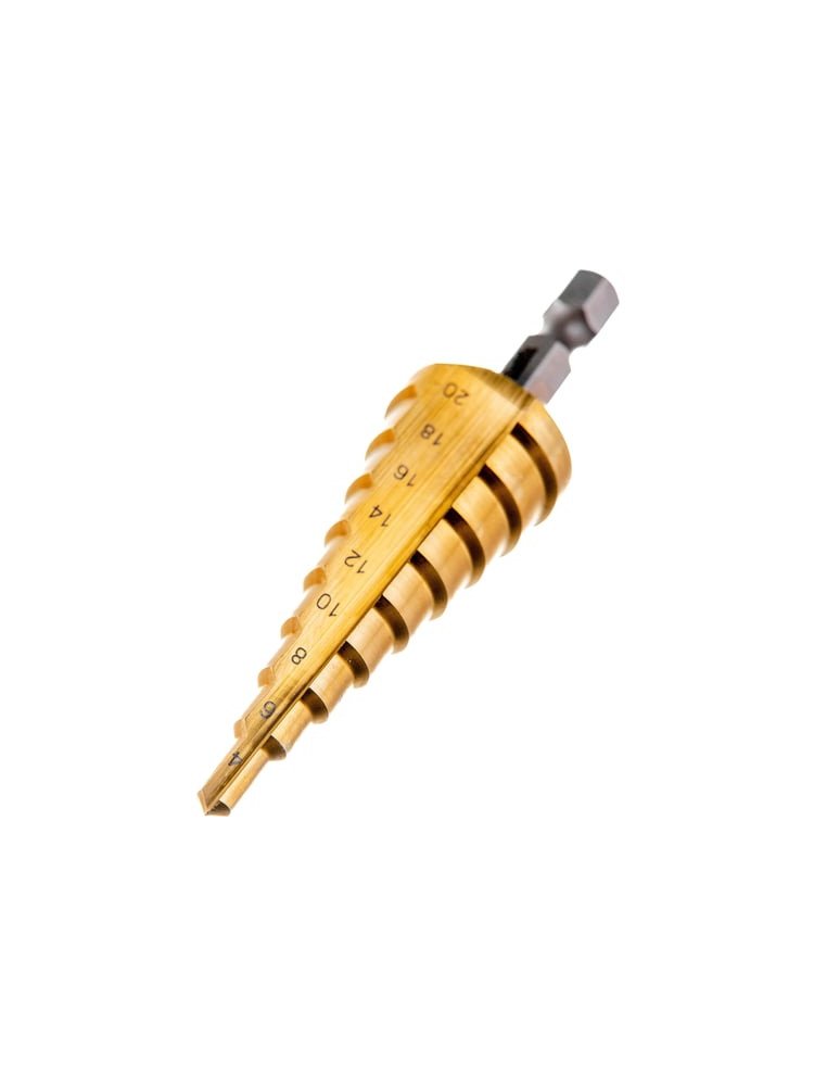 Идеальный выбор для сверления отверстий разного диаметра в металле — ступенчатое сверло "MAKITA HSS-TIN" 4-20 мм с 9 ступенями, покрытое износостойким нитридом титана. Подходит для обработки листовой стали, цветных металлов и пластика — оптимальный инструмент для монтажных, строительных и ремонтных работ.