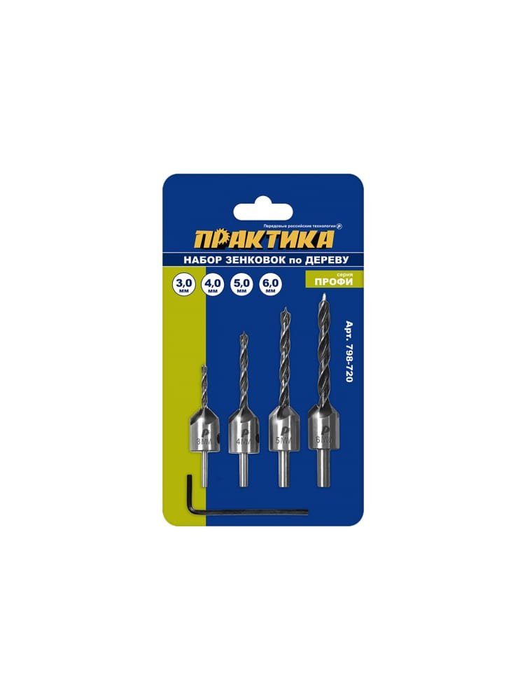 - В комплекте 4 зенковки размеров 3, 4, 5, 6 мм – охват самых популярных типоразмеров для работы с саморезами и болтами.