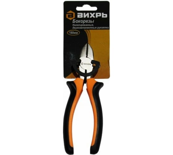Бокорезы 180мм, никелированные, двухкомпонентные рукоятки Вихрь используются для работы с тонким листовым металлом, проводами или проволокой. Изделие имеет высокую прочность и эргономичные рукоятки с упорами для пальцев. Закалённые кромки, длина 180 мм, эргономичные рукоятки и изоляция — для удобной и точной резки проводов и кабеля в электромонтаже.