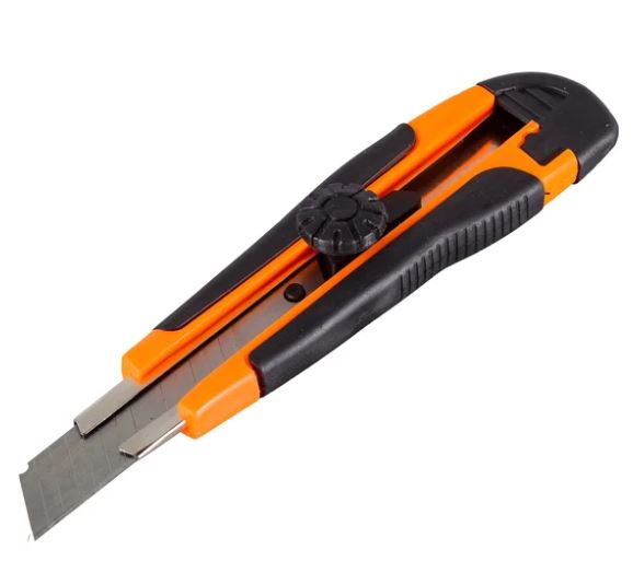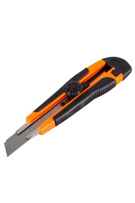 Нож с выдвижным лезвием 18 мм, двухкомпонентный корпус, металлическая направляющая, винтовой фиксатор, Вихрь предназначен для резки различных материалов в бытовых, хозяйственных или строительных целях. Нож имеет выдвижные, сегментированные сменные лезвия, которые можно отламывать по мере износа режущей части. Прочный строительный нож с винтовым фиксатором, лезвие 18 мм, обеспечивает безопасность и точность при работе с различными материалами.