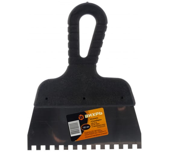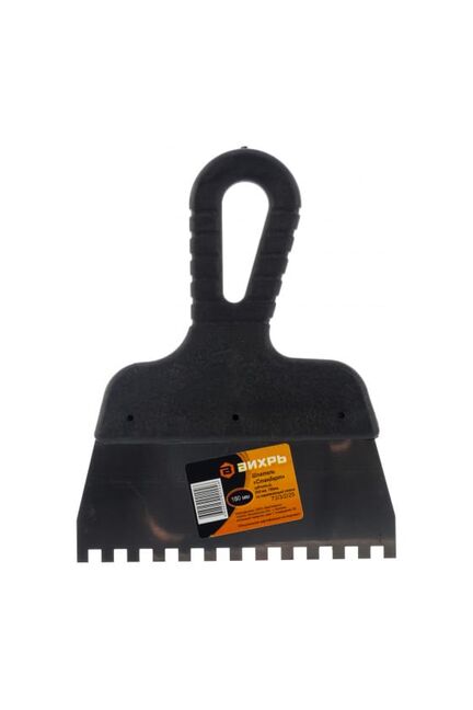 Зубчатый шпатель нержавеющая cталь, пластиковая рукоятка 6х6 мм, Вихрь используется для нанесения растворов на небольшую по площади поверхность. Нержавеющая сталь устойчива к химическим воздействиям со стороны цемента и компонентов плиточного клея Зубчатое лезвие из нержавеющей стали, удобная пластиковая рукоятка, размер зуба 6x6 мм, ширина 150 мм — оптимально для плиточных работ.