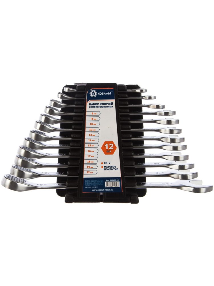 Набор ключей Кобальт позволяет с удобством выполнять откручивание и закручивание резьбовых соединений с шестигранными головками. В набор входят 12 комбинированных ключей с разными размерами захвата от 6 до 22 мм. Изготовленные из хромованадиевой стали и обладающие закаленной поверхностью, ключи отличаются высокими показателями износоустойчивости. Матовое хромовое покрытие предотвращает образование коррозии и позволяет комфортно удерживать ключ в руке. Вместе с ключами Кобальт поставляется пластиковый держатель для удобства эксплуатации. Набор из 12 комбинированных ключей 6–22 мм — универсальное решение для ремонта, сборки и обслуживания техники в любых условиях.