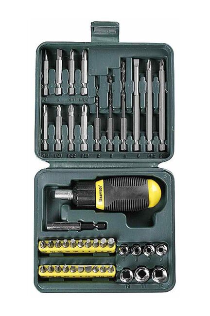 Набор KRAFTOOL предназначен для сверления, закручивания и выкручивания винтов, болтов и других видов крепежного элемента. В состав набора входят 43 предмета: 7 торцевых головок, 19 бит по 25 мм., 8 бит по 50 мм., 3 биты по 100 мм., 3 сверла, адаптер для головок, магнитный удлинитель для бит и реверсивная отвертка. Многофункциональность, 43 предмета, реверсивная отвертка, биты, головки, сверла, надёжный кейс и долговечные материалы для любых задач.