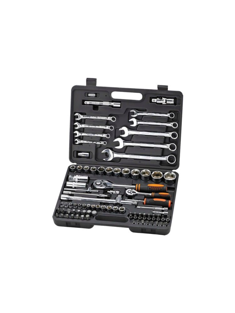 • 82 предмета в комплекте: трещотки 1/2" и 1/4", головки, удлинители, битодержатель, разнообразные насадки и аксессуары.