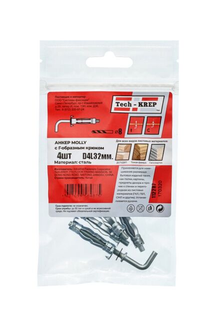 Анкер (дюбель) Молли W с крюком М4х32 от Tech-Krep представляет собой надежный крепежный элемент, предназначенный для монтажа в пустотелые основания, такие как гипсокартон, ДСП или тонкие панели. Изготовлен из прочной стали с антикоррозийным покрытием, что обеспечивает долговечность и стойкость к внешним воздействиям. Крюк позволяет удобно подвешивать различные предметы, а конструкция дюбеля гарантирует прочное и безопасное крепление за счет раскрытия лепестков внутри материала основания. В упаковке 4 штуки, что оптимально для небольших ремонтных или монтажных работ.
