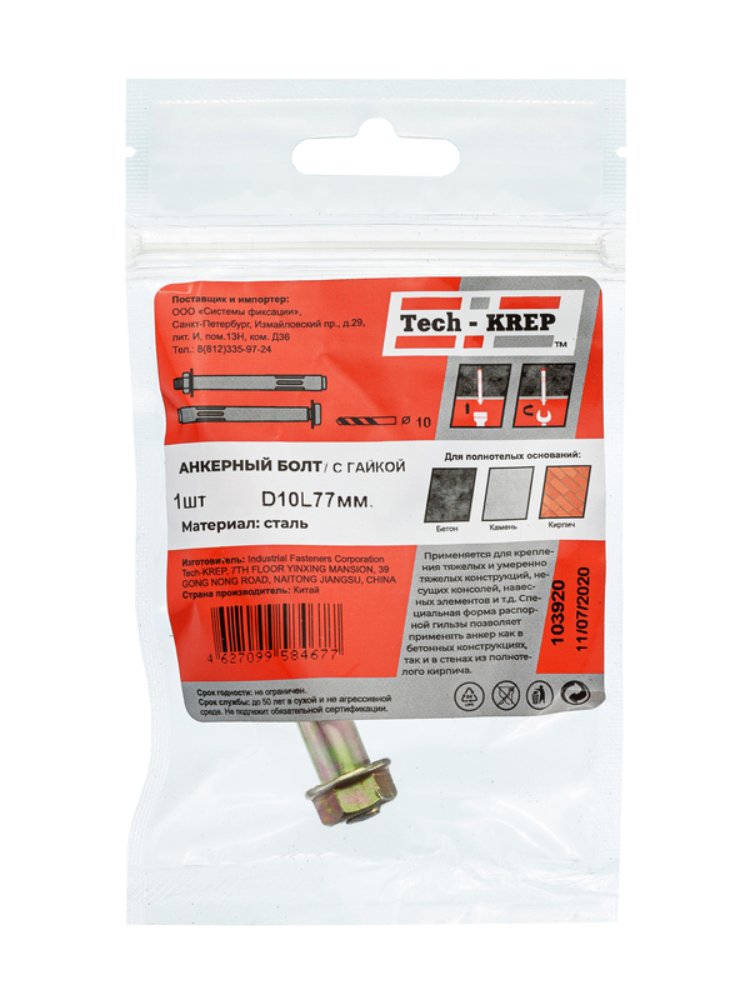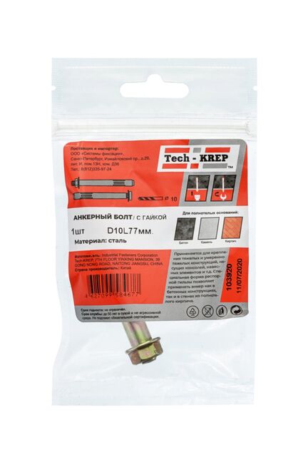 Анкерный болт с гайкой Tech-Krep 10х77 мм - надежный крепеж для бетона и кирпича. Сталь с антикоррозийным покрытием, в комплекте 1 шт.