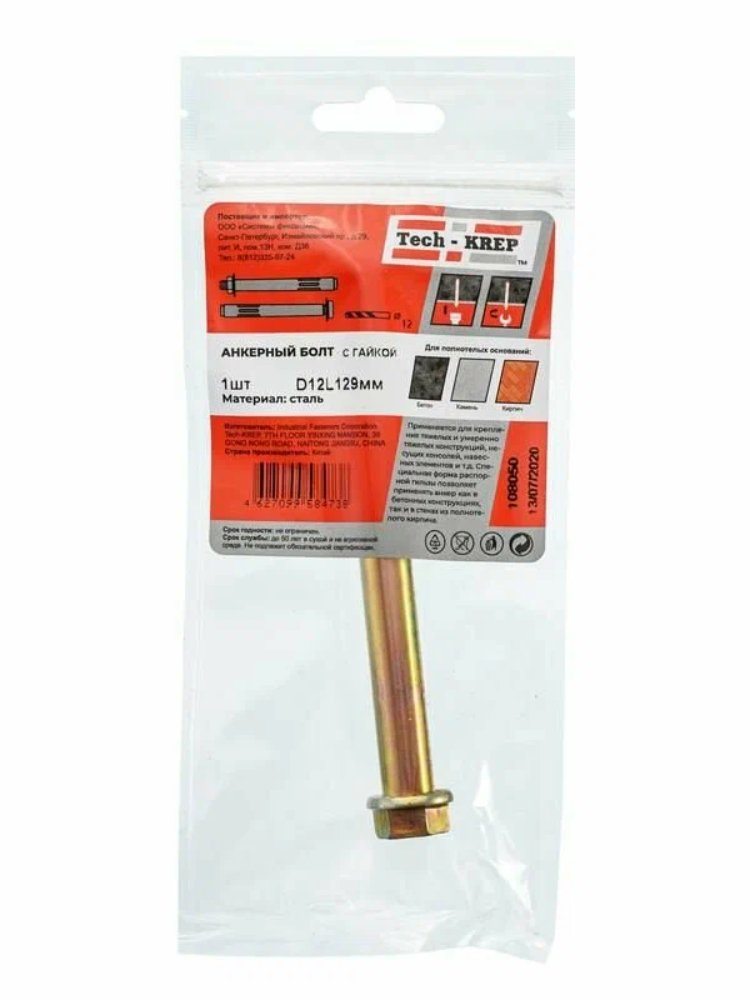 Анкерный болт с гайкой 12х129 мм от Tech-Krep представляет собой надежный крепежный элемент, предназначенный для фиксации конструкций к бетонным, кирпичным или каменным основаниям. Изготовлен из высокопрочной углеродистой стали с антикоррозийным покрытием, что обеспечивает долговечность и устойчивость к воздействию окружающей среды. Диаметр болта 12 мм и длина 129 мм позволяют использовать его для крепления тяжелых конструкций. Комплектуется гайкой для удобства монтажа. Подходит для установки в условиях высоких нагрузок, обеспечивая прочное и стабильное соединение.