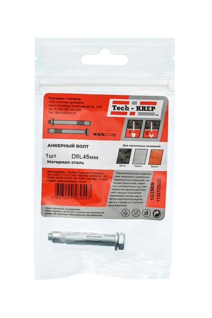 Анкерный болт 8х45 мм Tech-Krep для прочного крепления в бетоне и кирпиче. Сталь с цинковым покрытием, высокая нагрузочная способность, 1 шт. в упаковке.