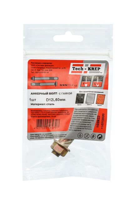 Анкерный болт с гайкой 12х60 (1 шт) - пакет Tech-Krep