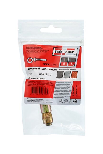 Анкерный болт с кольцом 14х70 мм от Tech-Krep представляет собой надежный крепежный элемент, предназначенный для фиксации конструкций к бетонным, кирпичным или каменным основаниям. Изготовлен из высокопрочной стали с антикоррозийным покрытием, что обеспечивает долговечность и устойчивость к внешним воздействиям. Диаметр 14 мм и длина 70 мм позволяют использовать его для крепления тяжелых элементов, а кольцо на конце болта упрощает монтаж подвесных систем или тросов. Упаковка содержит 1 штуку, что удобно для точечного применения.