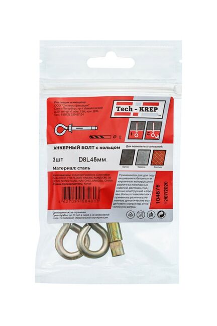 Анкерный болт с кольцом 8х45 мм от Tech-Krep представляет собой надежный крепежный элемент, предназначенный для создания прочных соединений в строительных конструкциях. Изготовлен из высококачественной стали с антикоррозийным покрытием, что обеспечивает долговечность и устойчивость к внешним воздействиям. Комплект включает 3 болта, что делает его удобным для небольших монтажных работ. Конструкция с кольцом позволяет использовать болт для подвеса грузов или крепления тросов, цепей и других элементов. Диаметр 8 мм и длина 45 мм подходят для работы с различными материалами, включая бетон, кирпич и камень.