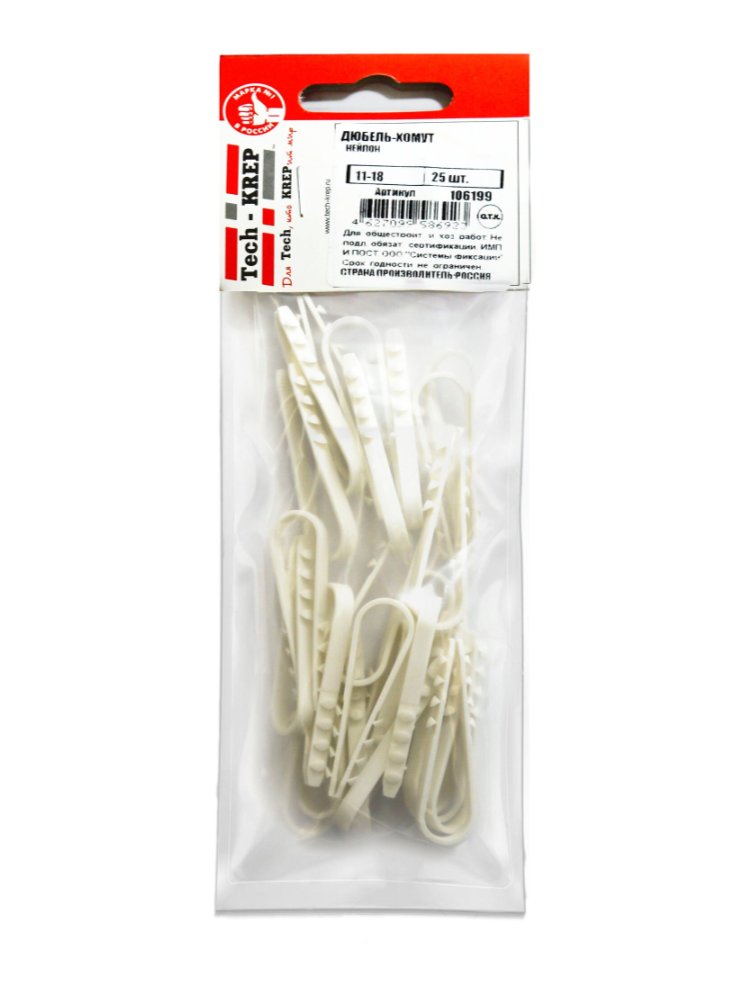 Дюбель-хомут из нейлона размером 11-18 мм в упаковке по 25 штук от Tech-Krep предназначен для надежного крепления проводов, кабелей и труб к поверхностям из бетона, кирпича или дерева. Изготовлен из прочного и долговечного материала, устойчивого к перепадам температур и воздействию влаги, что обеспечивает долгий срок службы. Конструкция хомута позволяет быстро и удобно зафиксировать элементы без использования дополнительных инструментов, а пакетное исполнение упрощает хранение и транспортировку.