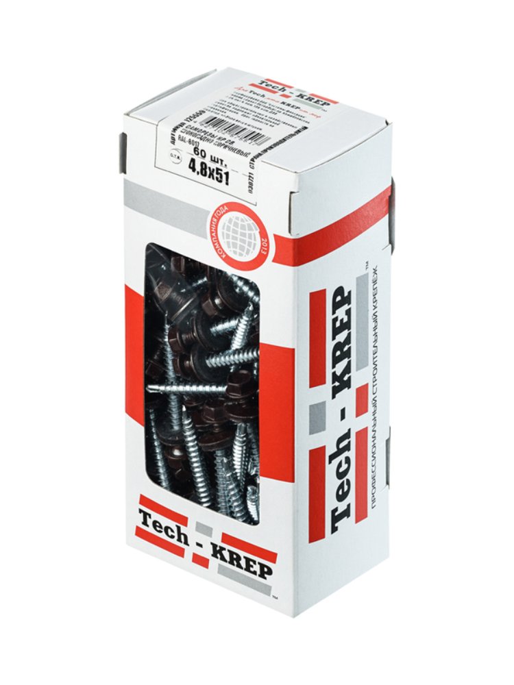 Саморезы КР светлые 4,8х51 мм в цвете RAL-8017 (шоколадно-коричневый) от Tech-Krep представляют собой надежные крепежные изделия, предназначенные для монтажа кровельных и фасадных материалов. Изготовлены из углеродистой стали с антикоррозионным покрытием, что обеспечивает долговечность и устойчивость к атмосферным воздействиям. Диаметр 4,8 мм и длина 51 мм делают их универсальными для работы с металлическими и деревянными конструкциями. Комплект поставляется в удобной коробке с окном, содержащей 60 штук, что упрощает хранение и использование. Шестигранная головка обеспечивает удобство закручивания с помощью шуруповерта или ключа. Цветовое покрытие RAL-8017 идеально подходит для эстетичного оформления конструкций в коричневых тонах.