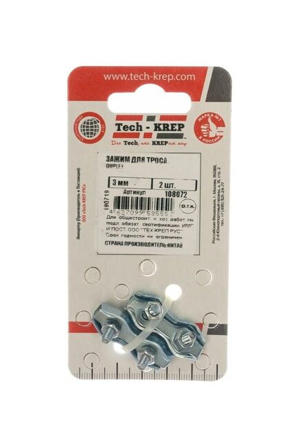 Зажим для троса Duplex 3 мм Tech-Krep, 2 шт. Прочная стальная конструкция с оцинковкой, надежная фиксация, подходит для стройки и быта.