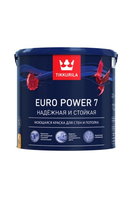 Матовая краска EURO POWER 7 C объемом 2,7 л. Благодаря инновационной формуле краска образует прочное, однородное и износостойкое покрытие, которое сохраняет насыщенность цвета даже после многократной влажной уборки.