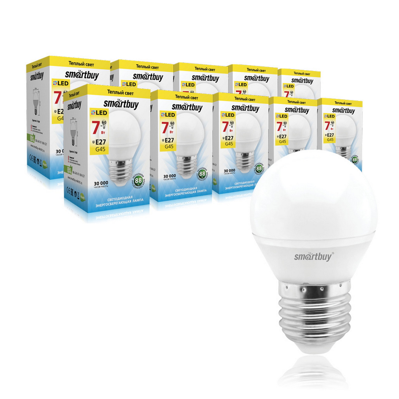 Экономичная 7Вт LED-лампа G45 E27, 3000К, тёплый свет, срок службы 30 000 часов. Идеально для дома, офиса и коммерческих помещений.