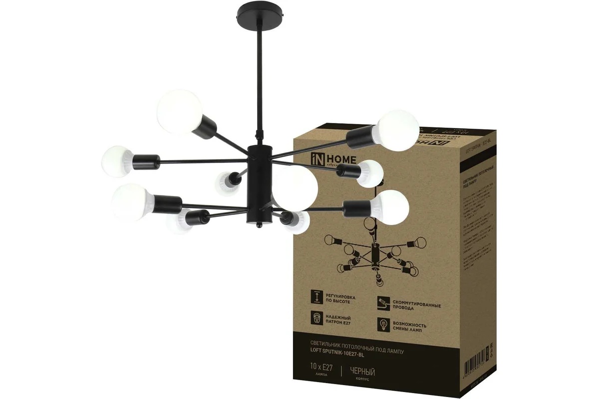 Светильник потолочный под 10 ламп Е27 LOFT SPUTNIK черный IN HOME в Переяславка