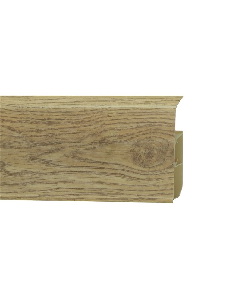 Оцените современный интерьер с помощью стильного напольного плинтуса Quadro в текстуре дуба Ириска — идеальное решение для завершения отделки жилых и коммерческих помещений.