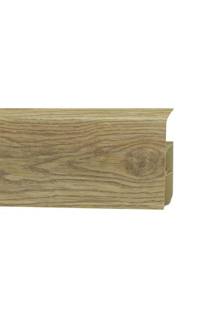 Утонченный и высокий профиль (80 мм) с острыми краями. Благодаря съёмной панели монтаж электрических проводов, покраска стен, оклеивание обоями возможны без демонтажа профилей. Конструкция позволяет монтировать и демонтировать плинтус без использования инструментов. Существует возможность размещения большого количества проводов, в том числе после монтажа. Специальная двухслойная технология: помимо слоя краски, дополнительно покрывается специальным лаком, благодаря чему его покрытие становится однородным, а это дополнительно защищает изделие от разного вида механических повреждений и вредного воздействия лучей УФ. Благодаря эластичному материалу, плинтус идеально прилегает даже к неровностям стен и полов. Высокий влагостойкий плинтус 80 мм с тёплой текстурой дуба, легко монтируется и скрывает кабели, защищая стены и подчёркивая стиль интерьера.