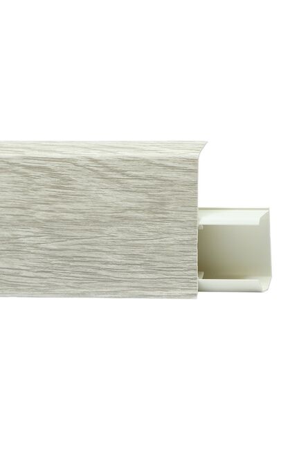 Плинтус 72 мм длиной 2,2 м, влагостойкий, с имитацией дуба, защищает стены и скрывает кабели, подходит для жилых и коммерческих интерьеров.