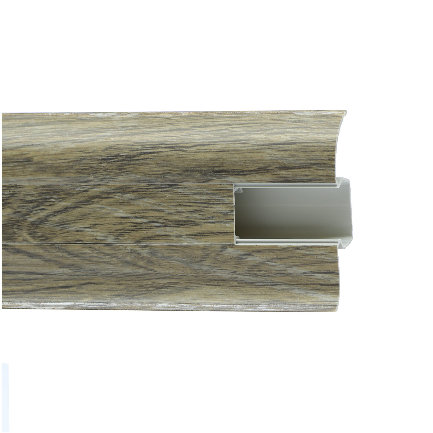 Износостойкий ПВХ-плинтус 58 мм с кабель-каналом: скрывает провода, устойчив к влаге и ударам, идеально сочетается с разными покрытиями.