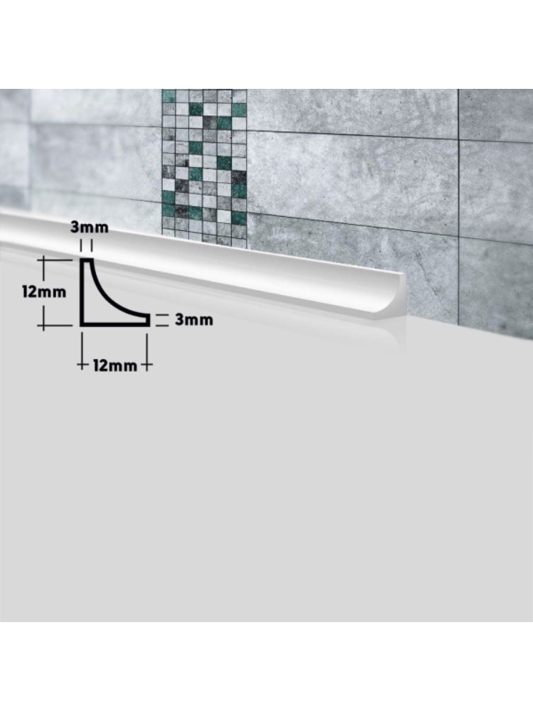 Служит для скрытия стыков между раковиной или ванной и стеной. Акриловый камень, из которого сделаны бордюры, очень плотный и прочный материал. В нем нет пор, поэтому в нём не заводятся плесень и грибок. Он прост в уходе, не боится влажности и бытовой химии, не меняет свой цвет и форму. Для распила потребуется ножовка по металлу или торцовочная пила с диском по дереву или алюминию, монтаж производится на герметик или водостойкий клей. Герметичный акриловый бордюр 12×12×1800 мм для влажных помещений, легко монтируется, устойчив к влаге, предотвращает появление плесени.
