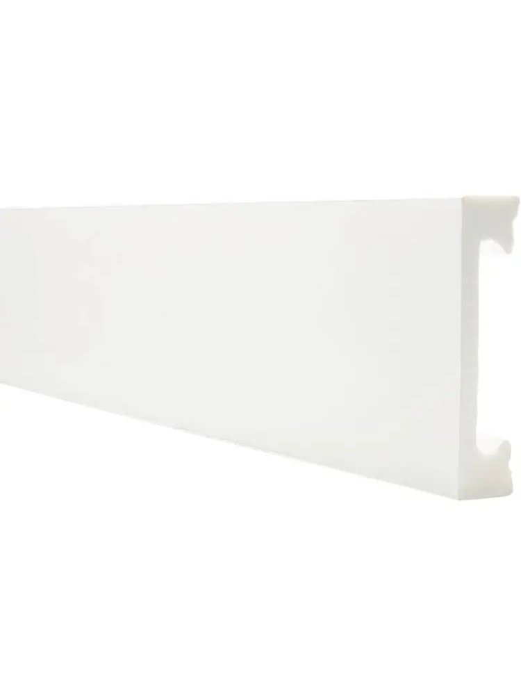 Предназначен для помещений с ламинатом, паркетом, линолеумом и ковровым покрытием. Полимер высокой прочности. Ударопрочный. 100% влагостойкий. Универсальный монтаж – клей или монтажная планка. Возможно многократное окрашивание. Монтаж электрических проводов, покраска стен, оклеивание обоями возможны без демонтажа профилей. Белый плинтус из дюрополимера 80×20 мм, влагостойкий, прочный, лёгкий в установке и уходе, подходит для любых помещений.