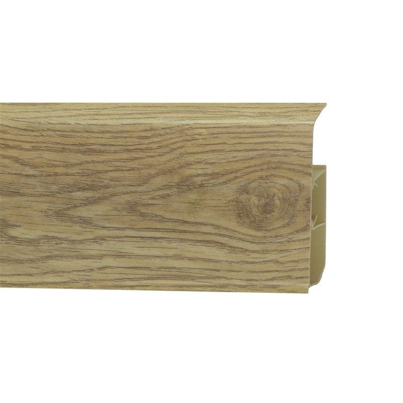 Утонченный и высокий профиль (80 мм) с острыми краями. Благодаря съёмной панели монтаж электрических проводов, покраска стен, оклеивание обоями возможны без демонтажа профилей. Конструкция позволяет монтировать и демонтировать плинтус без использования инструментов. Существует возможность размещения большого количества проводов, в том числе после монтажа. Специальная двухслойная технология: помимо слоя краски, дополнительно покрывается специальным лаком, благодаря чему его покрытие становится однородным, а это дополнительно защищает изделие от разного вида механических повреждений и вредного воздействия лучей УФ. Благодаря эластичному материалу, плинтус идеально прилегает даже к неровностям стен и полов. Внутренний уголок из прочного пластика, подходит для плинтусов 80 мм, легко монтируется, устойчив к износу, реалистичная текстура дуба.