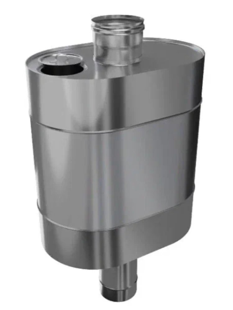 Надёжный и вместительный бак объёмом 50 литров оптимален для организации водоснабжения и отопления в бане или доме, благодаря продуманной эллиптической форме и удобному расположению на трубе диаметром 115 мм.
