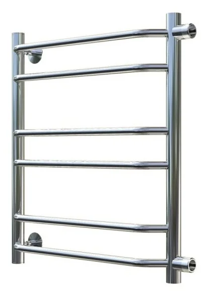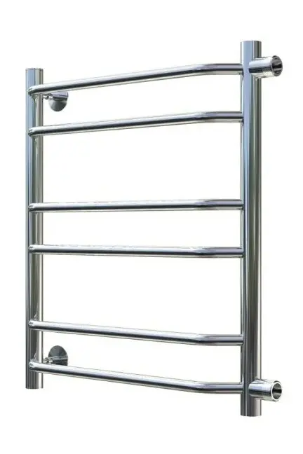 Компактный водяной полотенцесушитель 50×60×50 см из хромированной стали, устойчив к коррозии, быстро сушит полотенца и экономит место.
