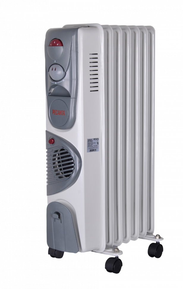 Масляный радиатор РЕСАНТА ОМ-7НВ, 1,9 кВт, с тепловентилятором, 7 секций, обогрев до 19 м², 3 режима, защита от перегрева, мобильный.