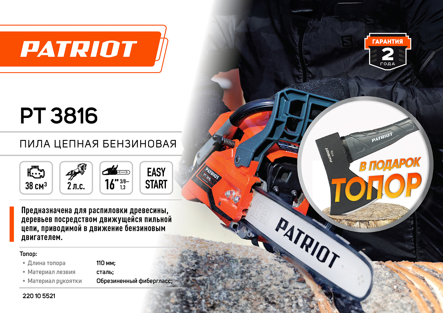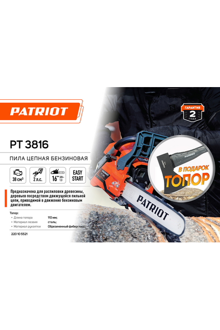 Бензопила PATRIOT PT 3816 + подарок топор PATRIOT APF-600