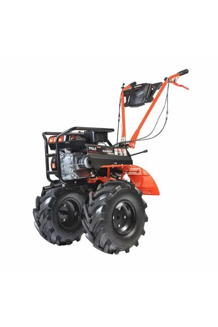 Урал - бензиновый мотоблок с 4-х тактным двигателем повышенного ресурса и цельнолитым чугунным цепным редуктором. Конструкция рамы облегчает транспортировку мотоблока и защищает двигатель, глушитель и бензобак. 4-х ступенчатая коробка передач. Перекидывание ремня между проточками трехручейкового шкива включает пониженную передачу. На сцепку устанавливается навесное оборудование или тележка. В комплекте закаленные фрезы, широкие колеса Extreme с глубоким протектором, сошник. Кнопка включения, рукоятка газа и рычаг привода расположены на руле. Наклон руля регулируется. Мотоблок 7,8 л.с. с колесами EXTREME: мощная обработка почвы, высокая проходимость, возможность подключения навески, экономичный и надежный.