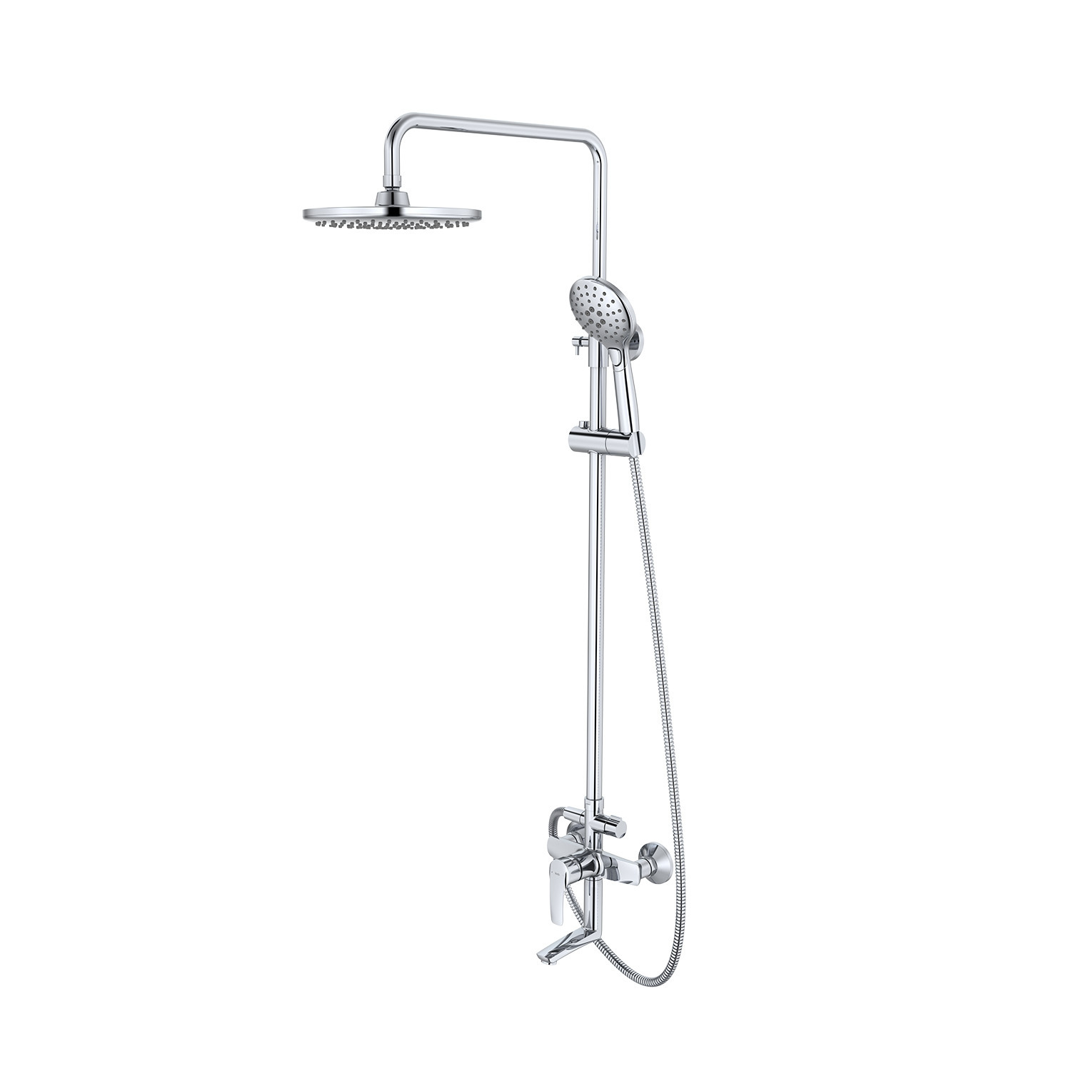 Гарантийный срок: Корпус смесителя – 10 лет, водозапорные механизмы – 5 лет, душевые аксессуары в комплекте – 3 года Душевая система с регулируемой стойкой, двумя лейками и смесителем, устойчива к коррозии, проста в установке, экономит воду и обеспечивает комфорт.