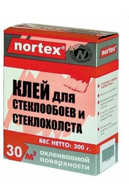 Клей для стеклообоев Nortex 300 г (сухой) обеспечивает прочное сцепление, подходит для тяжелых покрытий на бетоне, штукатурке, гипсокартоне, устойчив к влаге.