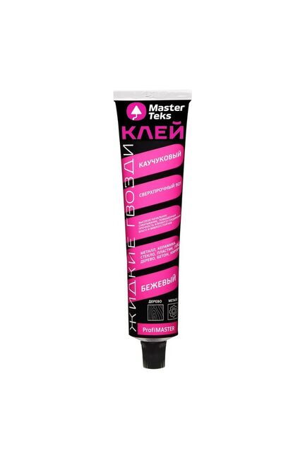 Клей каучуковый Жидкие Гвозди MasterTeks ProfiMaster 901 сверхпрочный Высокопрочный универсальный водонепроницаемый эластичный монтажный клей, применяется для наружных и внутренних работ, а также для работ во влажных помещениях ПРЕИМУЩЕСТВА: ● Очень высокое сцепление; ● Влаго и виброустойчив; ● Повышенная прочность клеевого соединения; ОБЛАСТЬ ПРИМЕНЕНИЯ: ● Предназначен для склеивания большинства строительных материалов: дерево, ДСП, ДВП, пластик, бетона, керамика, кирпич, гипс, металл, стекло в любом сочетании; ● Для крепления стеновых панелей, плинтусов, наличников, молдингов, декоративных элементов Термостойкость после отверждения от -20°C до +60°C Температура применения от +10°C до +30°C Сверхпрочный каучуковый клей: сильная фиксация, универсальность, влагостойкость, удобный тюбик 120 г, подходит для домашних и строительных работ.